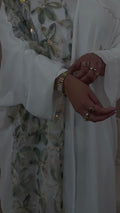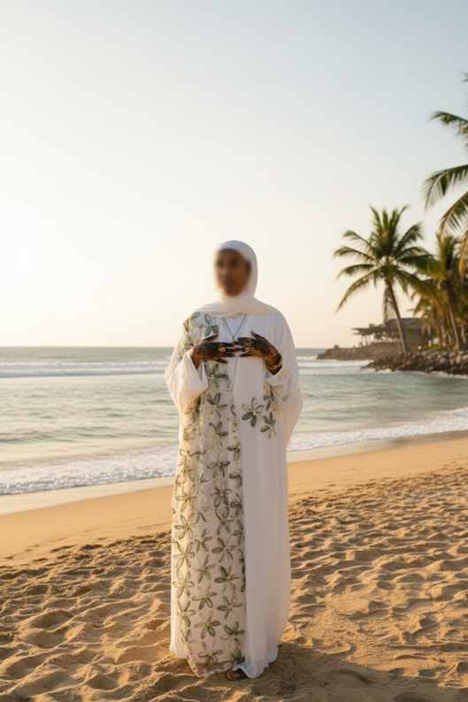 A dreamy design that embodies purity and grace. The inner dress is cut from high-quality textured silk, while the handmade white chiffon overlay is detailed with soft green 3D floral appliqués and crystal accents. Light, delicate, and feminine — this abaya is made for those unforgettable moments.