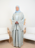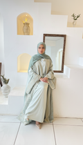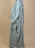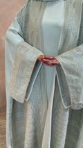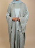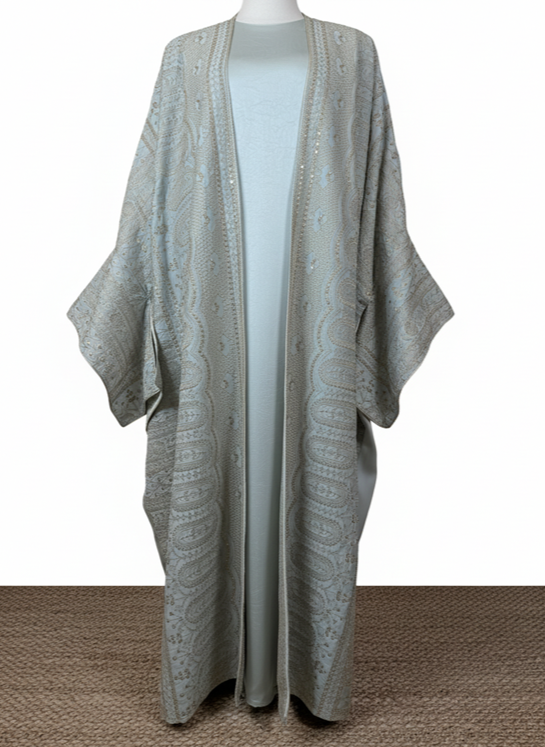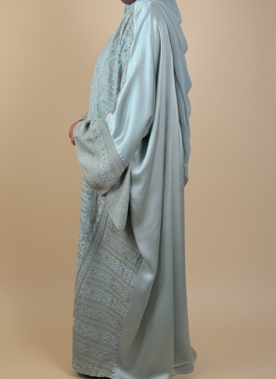 Elegant and serene, this abaya radiates sophistication in a refreshing mint green shade. The inner dress and back are cut from premium textured silk, while the open-front overlay is hand-embroidered with intricate floral and geometric detailing in shimmering gold. A refined balance of modesty and modernity.