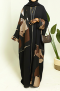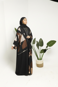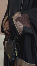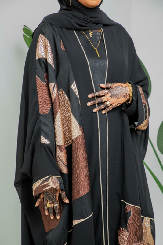 Bold and contemporary, this abaya is designed for the modern woman who loves effortless sophistication. The premium long-sleeve textured silk inner dress creates a luxurious base, while the flowing black chiffon overlay is adorned with abstract bronze and copper-toned patchwork for a striking contrast. A statement of elegance with a modern edge.