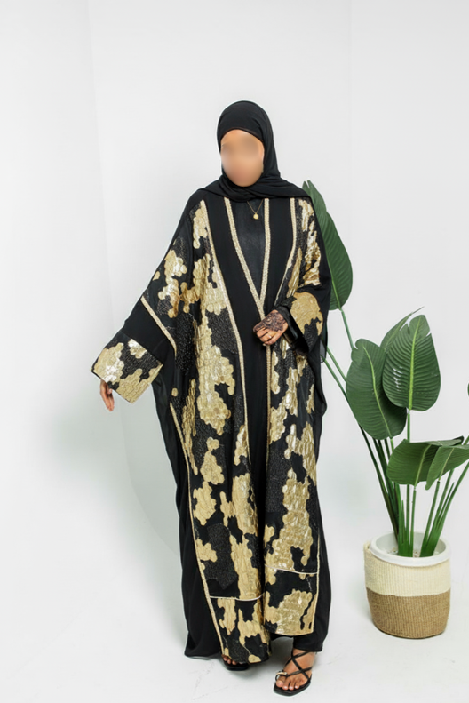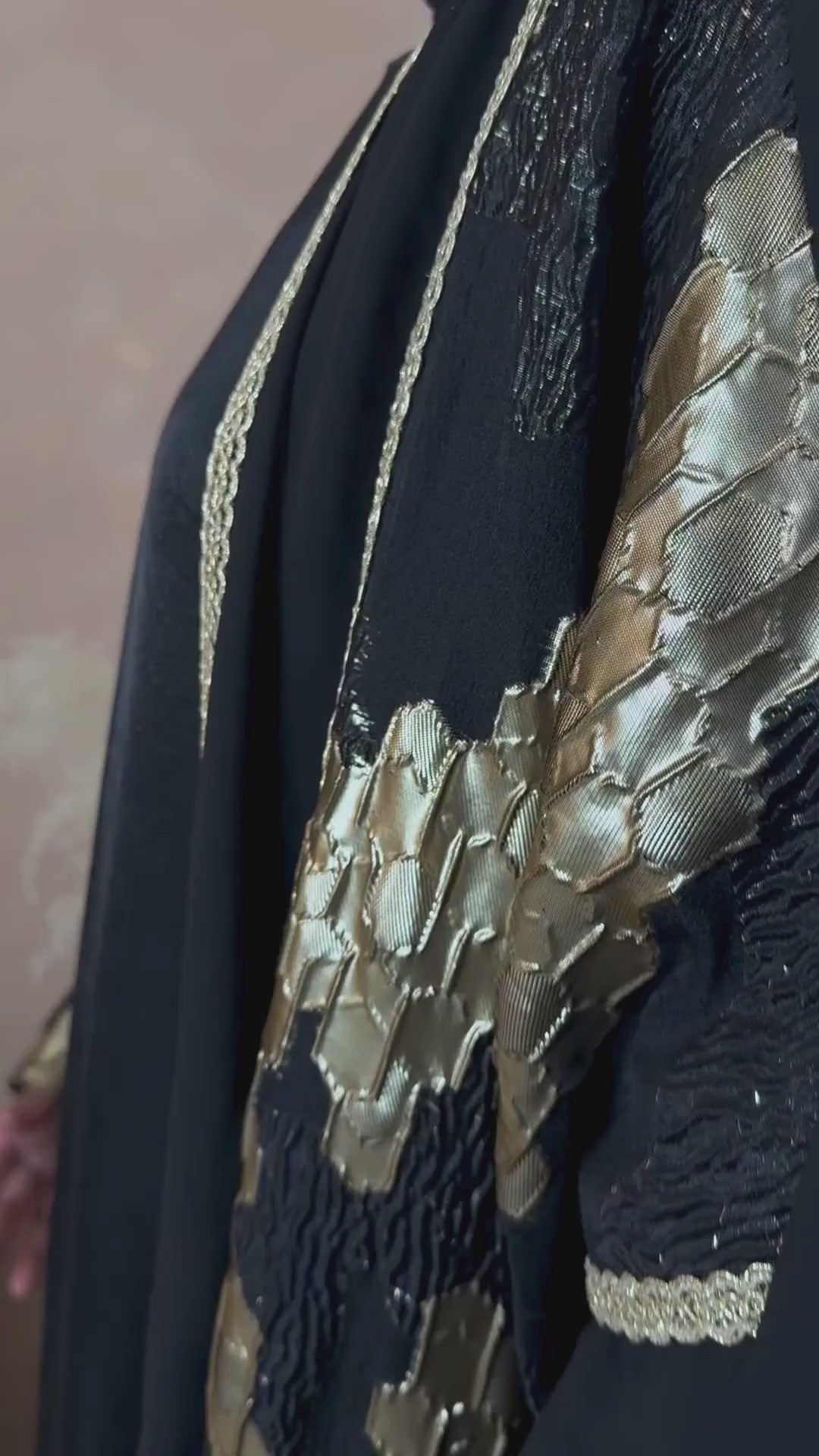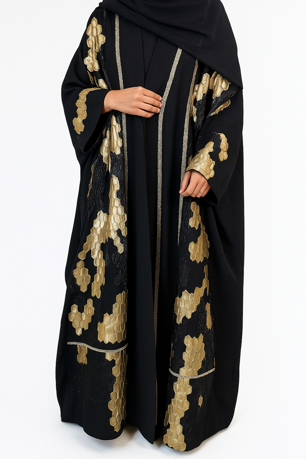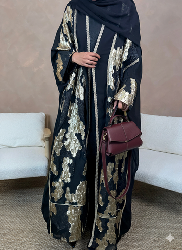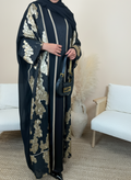 A bold statement piece that radiates sophistication. The textured silk inner dress creates a luxurious base, while the handmade black chiffon abaya overlay is adorned with rich metallic gold embroidery and framed with delicate lace trim. Striking and regal, this abaya is designed to stand out at evening events and special occasions.